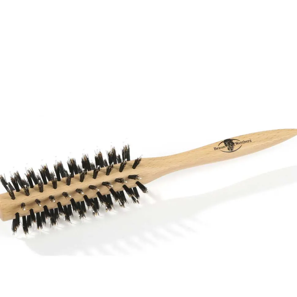 Die Braun & Wettberg Rundbürste 50 mm ist aus natur gewachsten, FSC-zertifiziertem Buchenholz gefertigt und verfügt über reine Naturborsten und Nylonstifte mit Kugelenden.