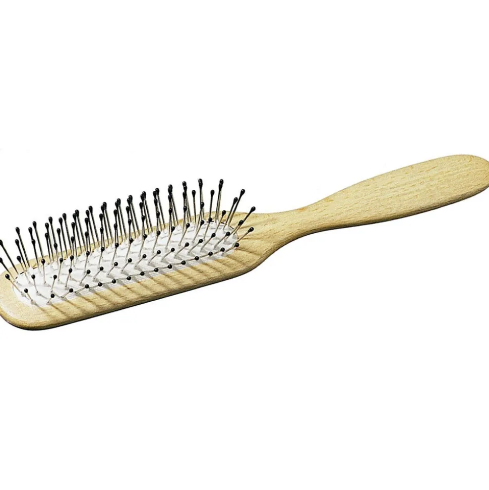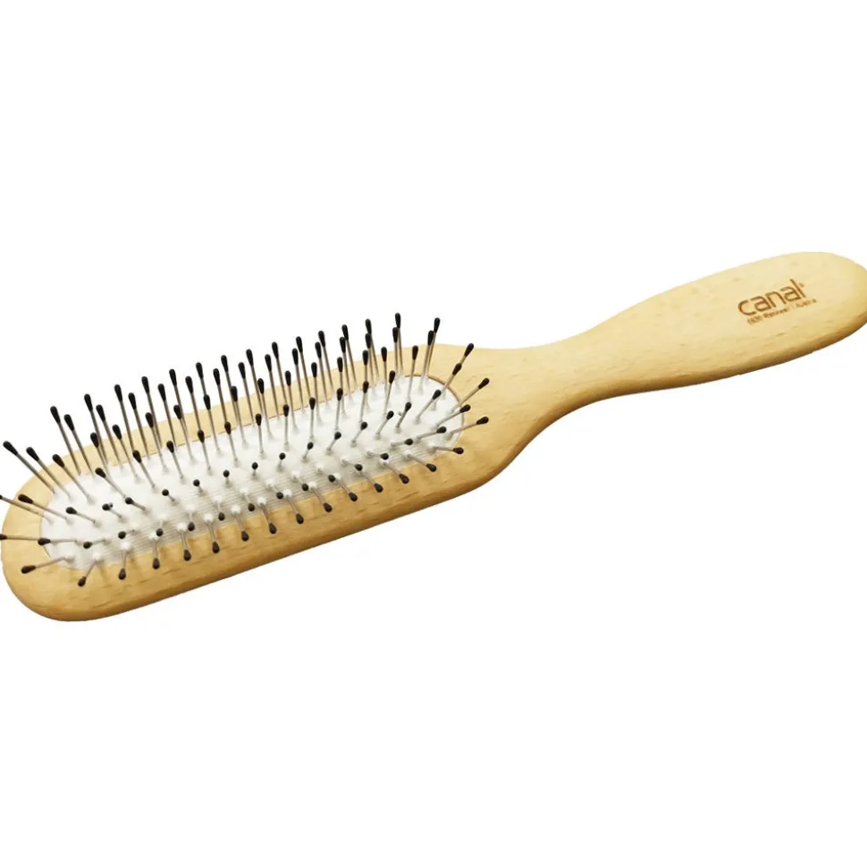 Die Canal Pneumatikbürste schmal hat Metallstifte und glättet und reinigt das Haar. Die Griffe sind aus heimischem, geöltem Buchenholz.