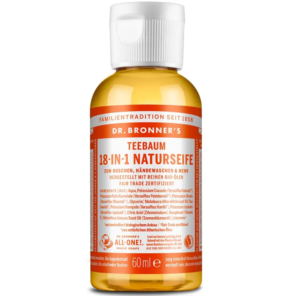 Dr. Bronner’s 18-in-1 Naturseife Teebaum reinigt Sie und alles was Sie umgibt auf natürliche Art und Weise und ohne zu fetten. Ob Gesicht, Körper, Haare oder Zähne; ob Wäsche, Haustiere oder Pflanzen – dieses Mittel ist für alles geeignet.