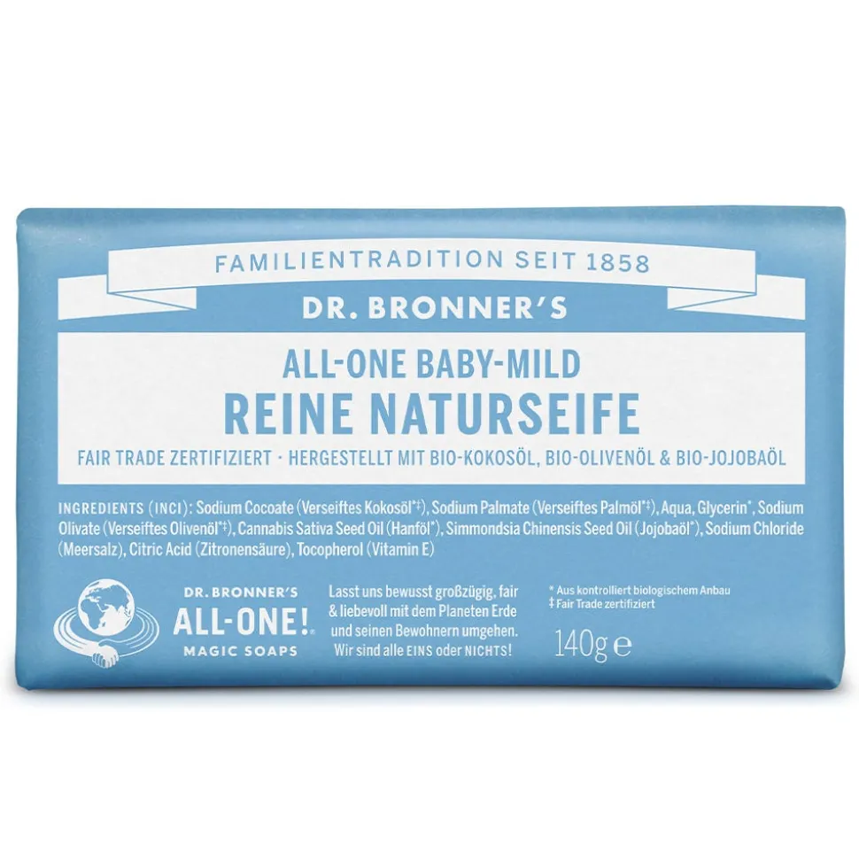 Dr. Bronner’s Reine Naturseife Baby-Mild ist eine Stückseife, die Ihre Hände, Ihr Gesicht und Ihren Körper sanft und natürlich reinigt. Ihre rein pflanzlichen Inhaltsstoffe sind aus kontrolliert biologischem Anbau und sind zu 100% biologisch abbaubar.