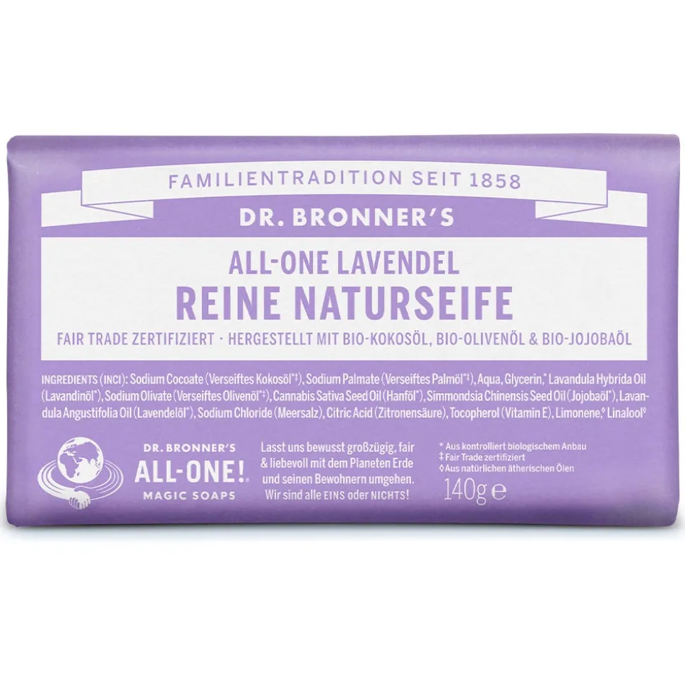 Dr. Bronner’s Reine Naturseife Lavendel ist eine Stückseife, die Ihre Hände, Ihr Gesicht und Ihren Körper sanft und natürlich reinigt. Ihre rein pflanzlichen Inhaltsstoffe sind aus kontrolliert biologischem Anbau und sind zu 100% biologisch abbaubar.