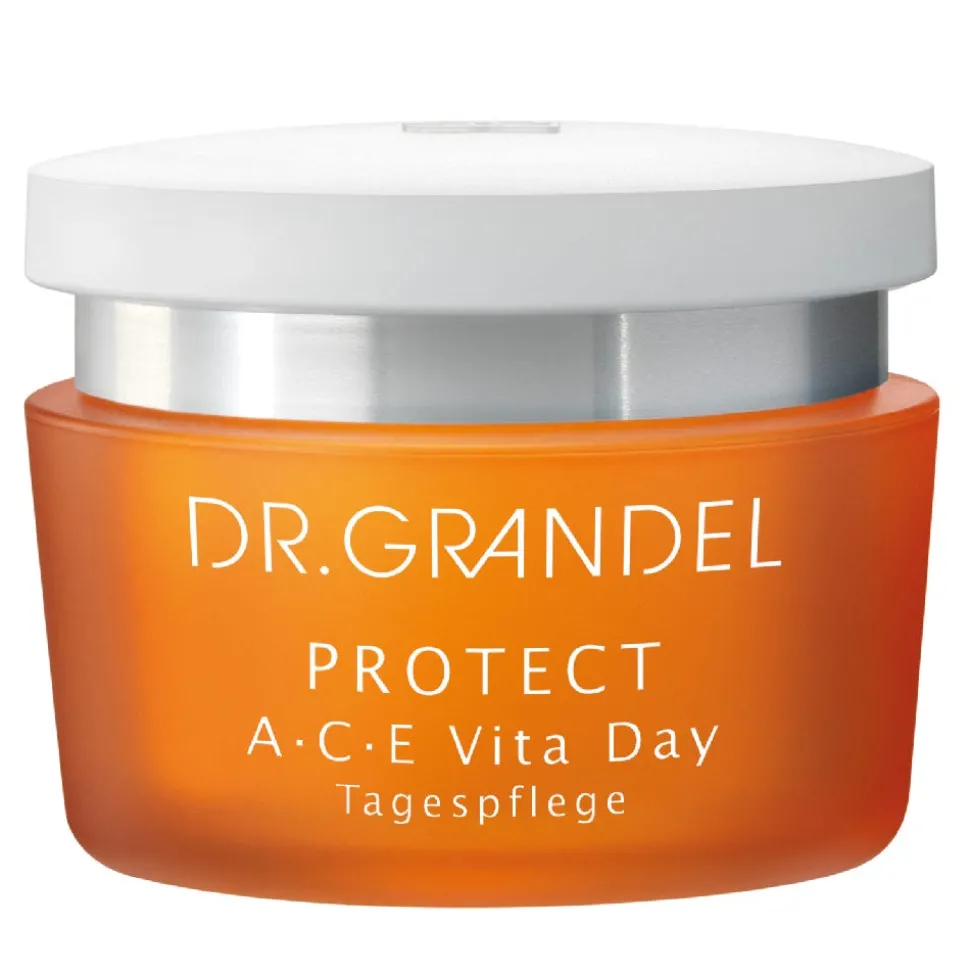 DR. GRANDEL Protect ACE Vita Day bewahrt die jugendliche Ausstrahlung der Haut und schenkt ihr täglich neue Vitalität. Die mikrofein verkapselten Vitamine und ein spezieller DNA-Schutz in der Tagespflege wirken gezielt Umweltbelastungen und vorzeitiger Hautalterung entgegen.