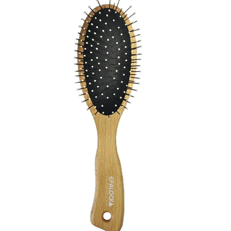 Die Efalock Drahtbürste Noppen oval mit einem Bürstenkörper aus Buchenholz und Metallstiften mit weißen Kunststoff-Noppen, angeordent in sieben Reihen.