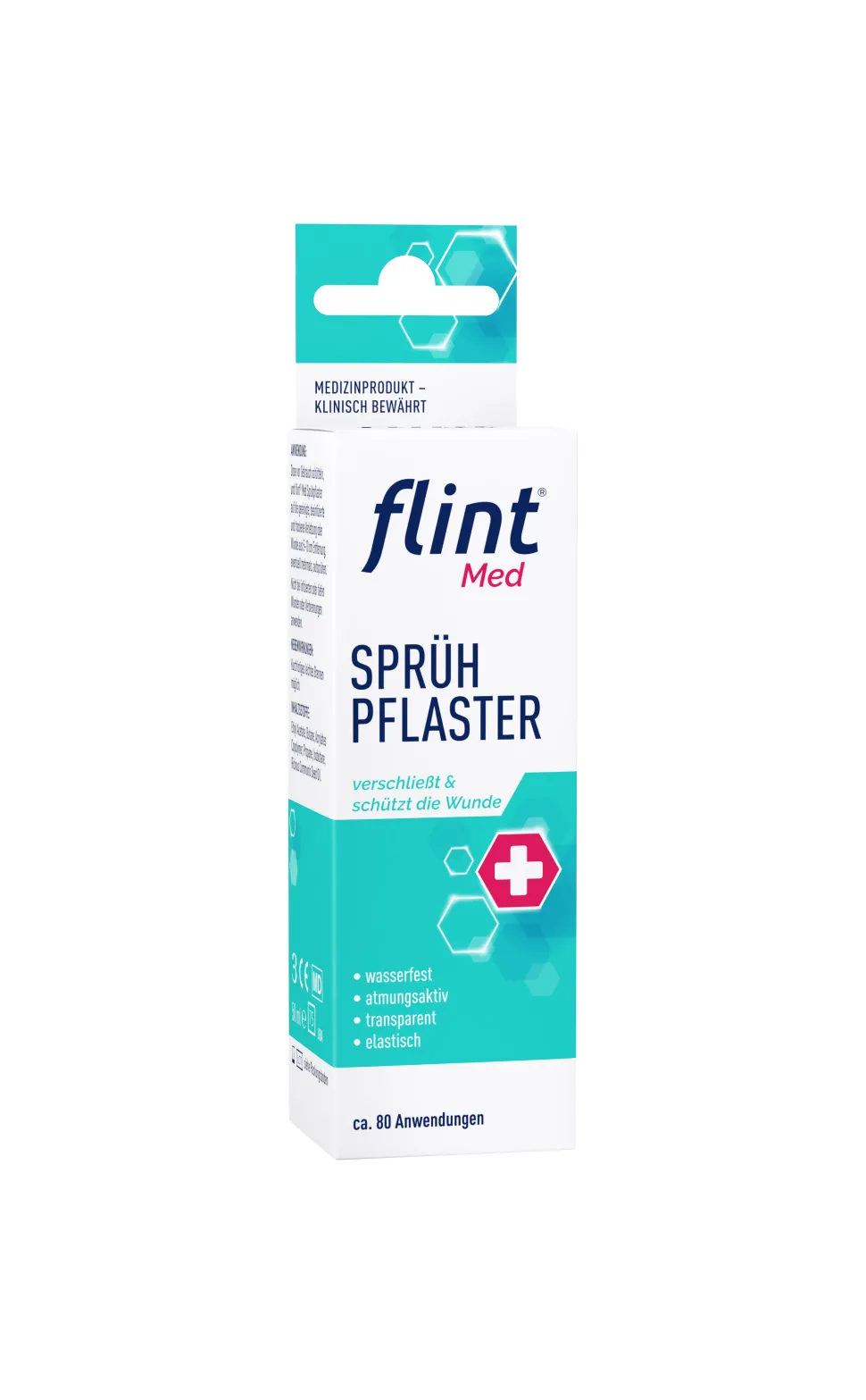 Das flint MED Sprühpflaster eignet sich für oberflächliche Wunden der Haut. Es deckt auch Hautpartien ab, die mit herkömmlichen Pflastern nicht geschützt werden können. Einfach auf die gereinigte Wunde aufsprühen.
