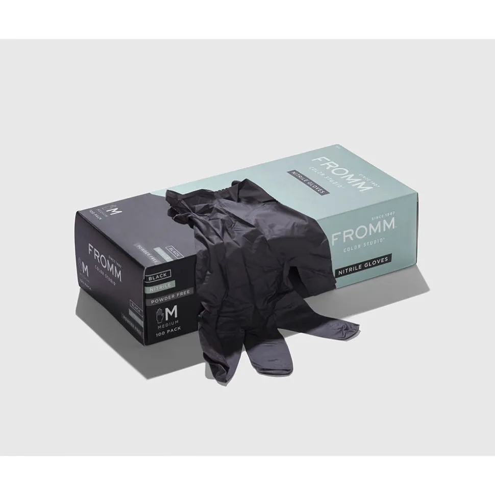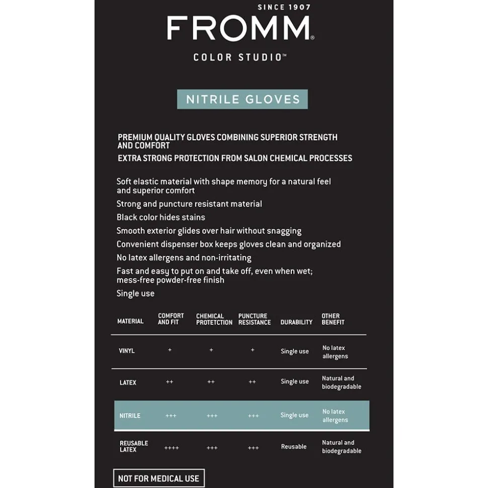 Fromm Puderfreie Nitrilhandschuhe in Premium-Qualität, die überragende Festigkeit und hohen Tragekomfort bieten. Extra starker Schutz vor chemischen Prozessen im Salon. Keine Latex-Allergene und nicht reizauslösend.
