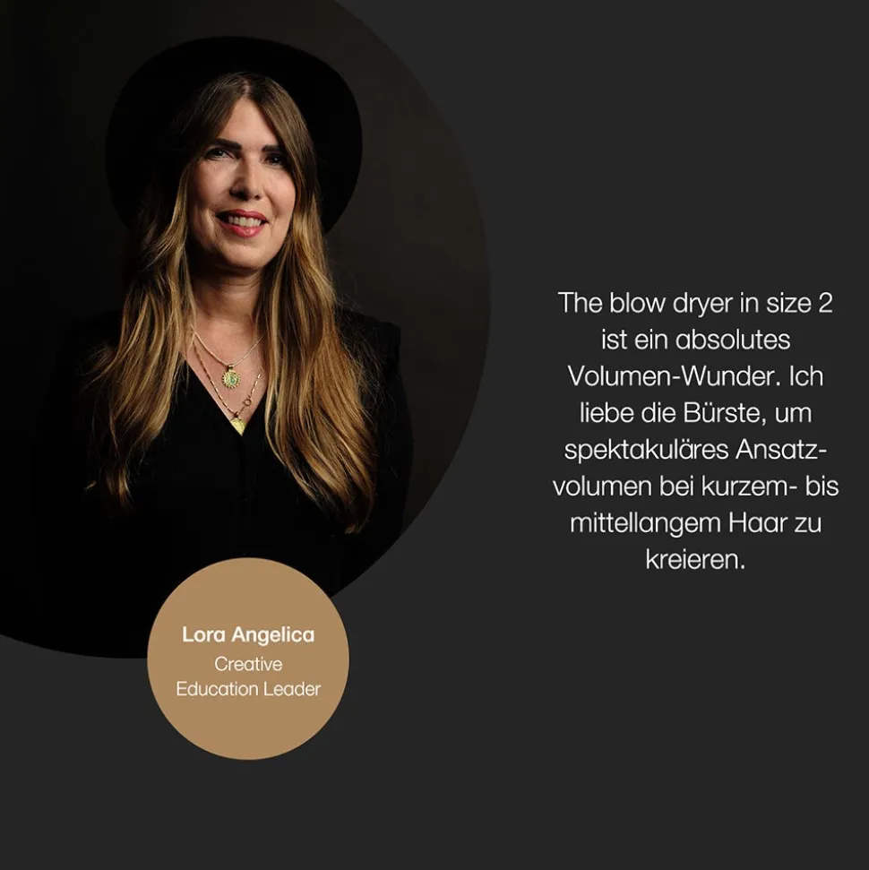 Styling-Tipp: Solltest du weniger Volumen wünschen, ziehe the blow dryer nach unten durch das Haar. Für mehr Volumen kannst du die Bürste nach oben wegziehen.