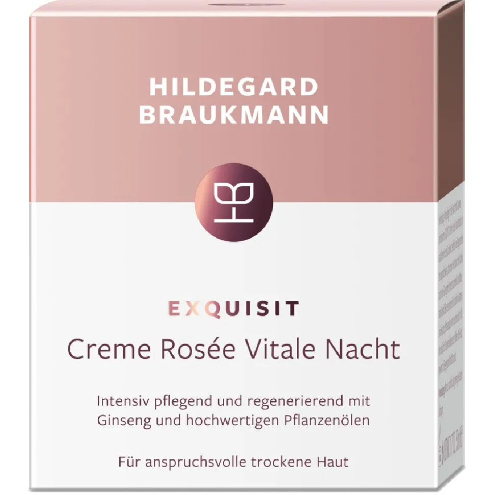 Die Hildegard Braukmann exquisit Créme rosèe vitale Nacht ist eine reichhaltige Aktivpflege für die Nacht mit Gamma-Linolensäure. Die Nachtpflege mit natürlichem Rosenöl, aktiviert effektiv die Regeneration der anspruchsvollen, trockenen Haut durch die Kombination von Ginseng mit Borretschsamenöl und Macadamia-Nussöl. Borretschsamenöl ist reich an Gamma-Linolensäure, die besonders der trockenen Haut hilft, ihre natürliche Barrierefunktion zu erfüllen. Die Haut gewinnt an Energie und Vitalität zurück.
