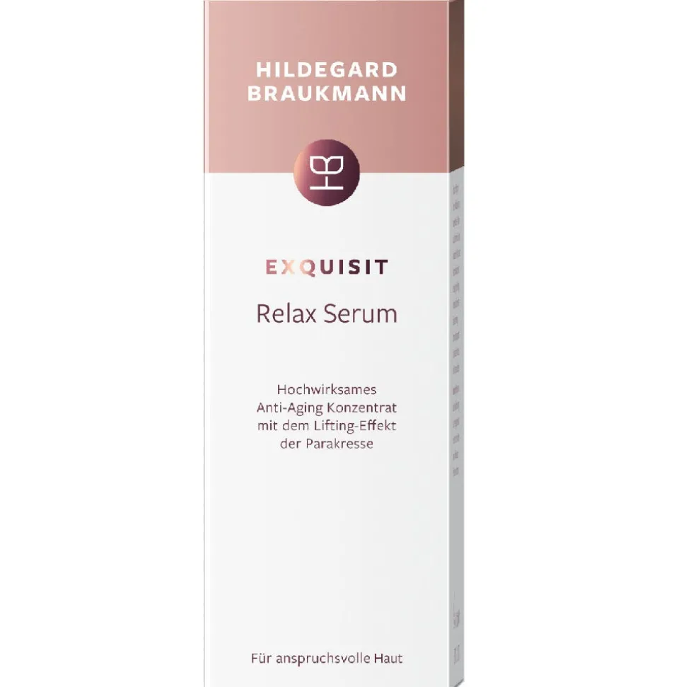 Das Hildegard Braukmann exquisit Relax Serum ist ein hochwirksames Anti-Aging Konzentrat mit dem Lifting-Effekt der Parakresse. Liposomen, mikrofeine Kügelchen aus natürlichem Soja-Lecithin, kombiniert mit Aloe Vera und Panthenol, wirken direkt in der Haut gegen Feuchtigkeitsverlust und vorzeitige Alterserscheinungen. Der muskelentspannende Extrakt aus der Parakresse mildert Linien und Falten.
