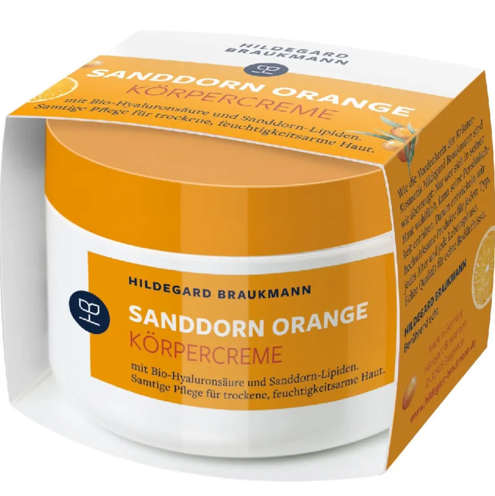 Die duftende Hildegard Braukmann Sanddorn Orange Körpercreme pflegt die Haut intensiv und ist wunderbar leicht zugleich. Hyaluronsäure ist ein hocheffektiver, hautaffiner Feuchtigkeitsspender, der Geschmeidigkeit, Elastizität und Spannkranft der Haut merklich verbessert. Sanddorn-Lipide regenerieren und stärken die hauteigene Hydrolipid-Barriere. Kakaobutter und Mangobutter pflegen und schützen. Vitamin E ergänzt die effektive Wirkstoffformel. Versorgt auch die trockene, feuchtigkeitsarme Haut optimal – für ein samtiges Hautgefühl. Fruchtiges Dufterlebnis mit natürlichem Orangenöl.