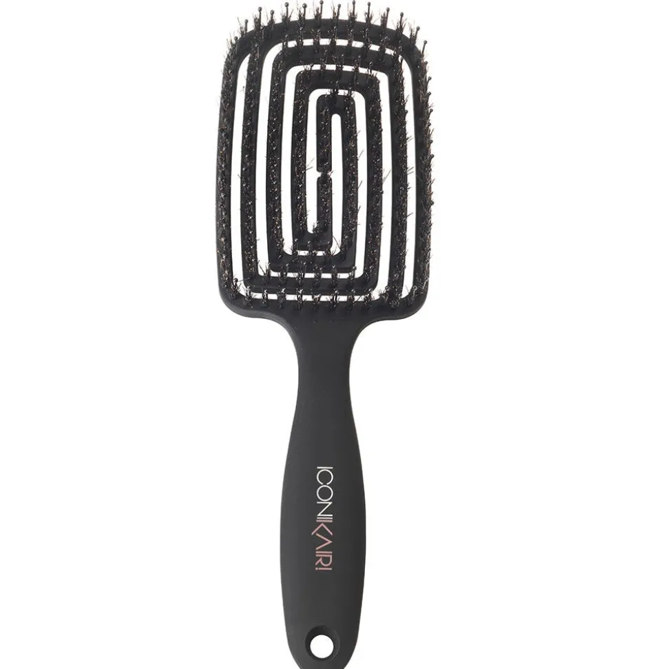 Die ICONIKAIR! Blow Dry Brush Bristle ist zum Bürsten von dünnem Haar ohne Volumen geeignet. Die Bürste besteht aus Nylon- und Wildschweinborsten. Die flexible und gewölbte Form des Bürstenkopfes bietet während des Bürstens eine angenehme Kopfhautmassage, die nicht nur dazu führt, dass alle Haare von der Kopfhaut gelöst werden können, sondern auch dass die Durchblutung der Kopfhaut angeregt wird. Die langen Premium Nylonborsten und die gebogene Form, die sich der Kopfform anpasst, sorgen dafür dass die Haare an den Wurzeln erreicht werden und so schonend entwirrt werden können. Die antistatische Beschichtung der Nylonborsten verhindert ein Aufladen der Haare beim Bürsten, was zu ungewollten fliegenden Haaren führen kann. Die Bürste ist luftdurchlässig, d.h. dass sich die Luft beim Föhnen nicht in der Bürste staut, sondern auf der anderen Seite entweichen kann. Dies verringert nicht nur die Föhnzeit, sondern schont Haar und Bürste. Die Blow Dry Brush ist zudem bei gewöhnlichem Gebrauch hitzebeständig und vollständig waschbar (mit der Hand), was sie antibakteriell macht und eine Verteilung von Bakterien auf Haar und Kopfhaut verhindert.