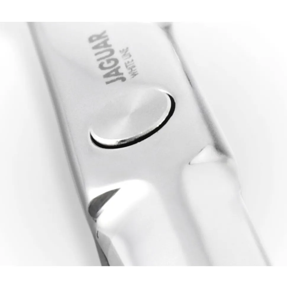 Die Jaguar Haarschneideschere Hera 6,25 hat ein abgerundetes Dolchblatt auf der Oberseite für besonders hohe Stabilität und enthält den Crane Design für ein entspanntes Arbeiten.