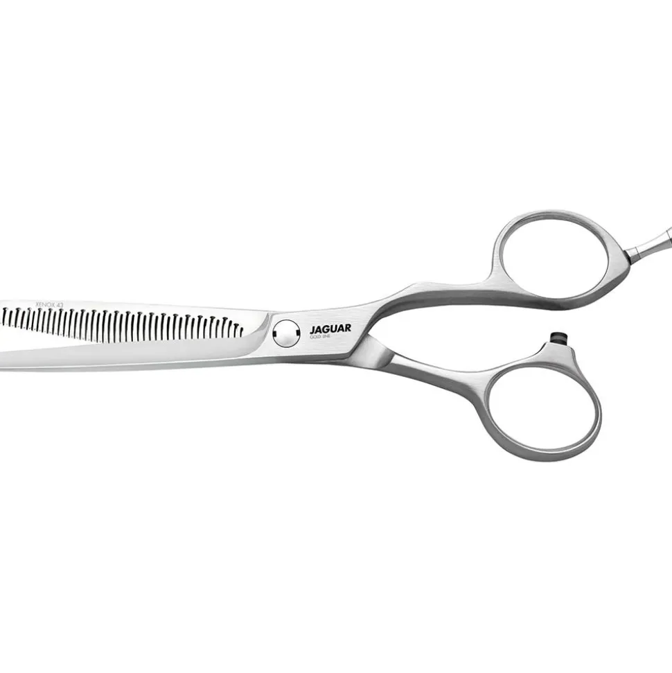 Die Jaguar Modelierschere Xenox 43 hat abgeschrägte Fingeraugen für ergonomisch optimale Position der Finger und eine leicht geschwungene Klinge für ein sanftes Schneidegefühl. Die Schere hat 43 gebogene Effilierzähne mit feinster Prismenverzahnung für ein besonders feines Schnittbild.