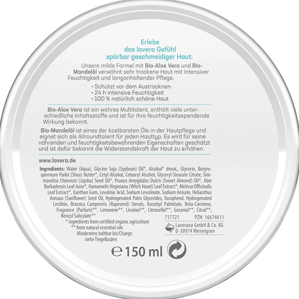 Die Lavera Basis Sensitiv Creme mit Bio-Aloe Vera & Bio-Mandelöl verwöhnt sehr trockene Haut mit intensiver Feuchtigkeit und langanhaltender Pflege. Bio-Aloe Vera ist ein wahres Multitalent, enthält viele unterschiedliche Inhaltsstoffe und ist für ihre feuchtigkeitsspendende Wirkung bekannt. Bio-Mandelöl ist eines der kostbarsten Öle in der Hautpflege und eignet sich als Allroundtalent für jeden Hauttyp. Es wird für seine nährenden und feuchtigkeitsspenden Eigenschaften geschätzt und ist dafür bekannt die Widerstandskraft der Haut zu erhöhen.