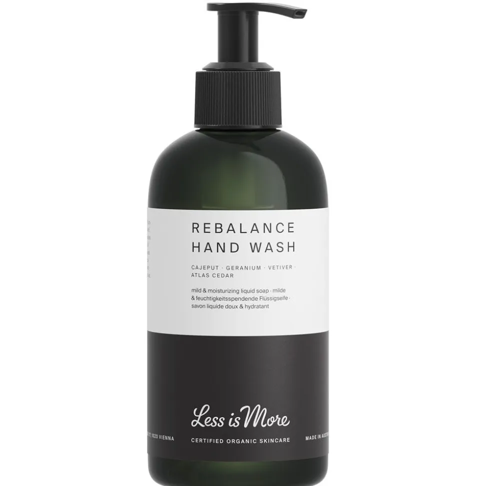 LESS IS MORE Rebalance Hand Wash ist eine milde Flüssigseife mit rückfettender Wirkung, die die Hände sanft reinigt und zugleich pflegt. Aloe Vera Frischsaft spendet intensive Feuchtigkeit und beruhigt die Haut. Natürliche Fermente fördern die Hydratation und unterstützen das Gleichgewicht der Haut. Der feine Duft und die besonders sanfte Formel machen die Handseife ideal für alle Hauttypen – auch für empfindliche Haut und Kinder.