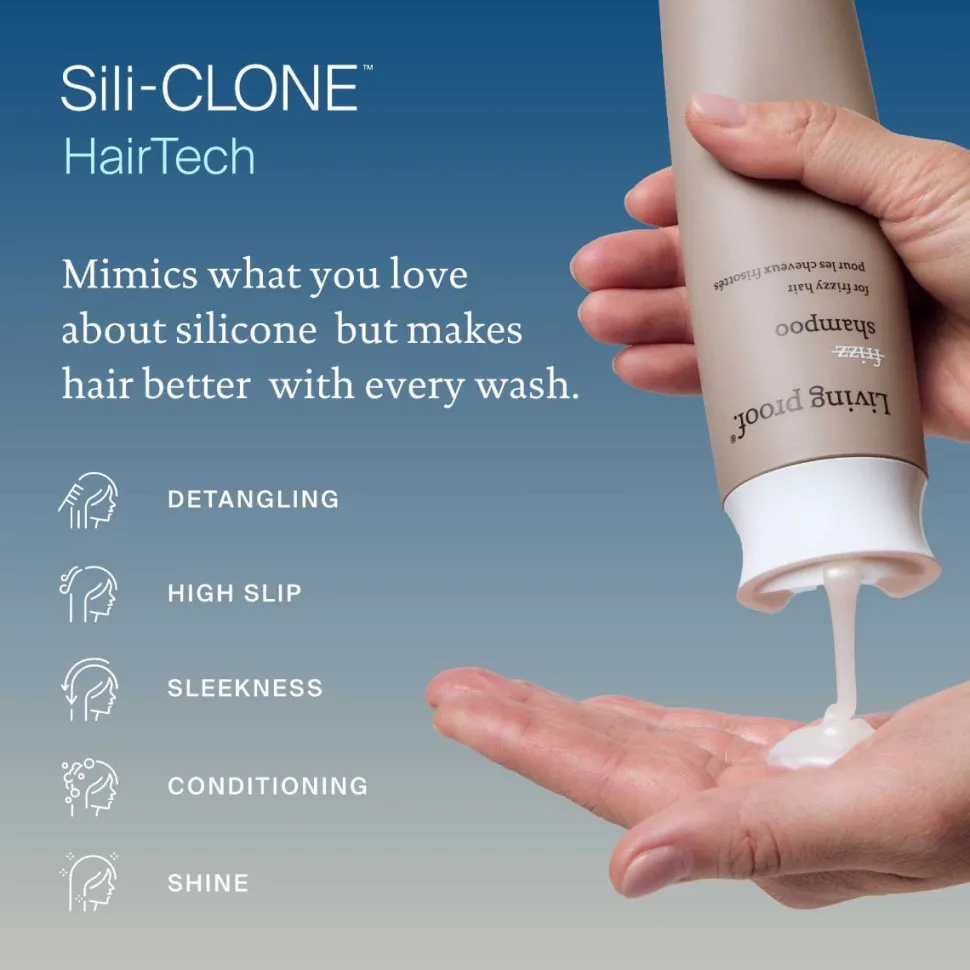 Sili-CLONE™ HairTech: Eine geschützte Technologie mit einer biologisch gewonnenen Fettsäure Fettsäurepolymer, Polyricinoleic acid, das die 5 wichtigsten Vorteile von Silikon nachahmt. Entwirrung, Gleitfähigkeit, Geschmeidigkeit, Pflege und Glanz – bei gleichzeitiger dauerhafter Hydratation bei jeder Haarwäsche.