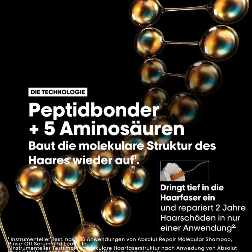 Das L’Oréal Professionnel Paris Serie Expert Absolut Repair Molecular Rinse-Off Serum wurde speziell für stark strukturgeschädigtes Haar entwickelt. Repariert 2 Jahre Haarschäden in nur einer Anwendung.* Angereichert mit 2% Peptidbondern und 5 Aminosäuren, dringt es tief in die molekulare Haarstruktur ein und verwandelt das Haar sofort. Die serumartige Textur zieht unmittelbar in die Haarfaser ein und sorgt für eine molekulare Reparatur**, ohne zu beschweren. Stärke, Elastizität und Beweglichkeit des Haares werden wiederhergestellt. Das Ergebnis: kräftiges, gesund aussehendes & fließendes Haar.
