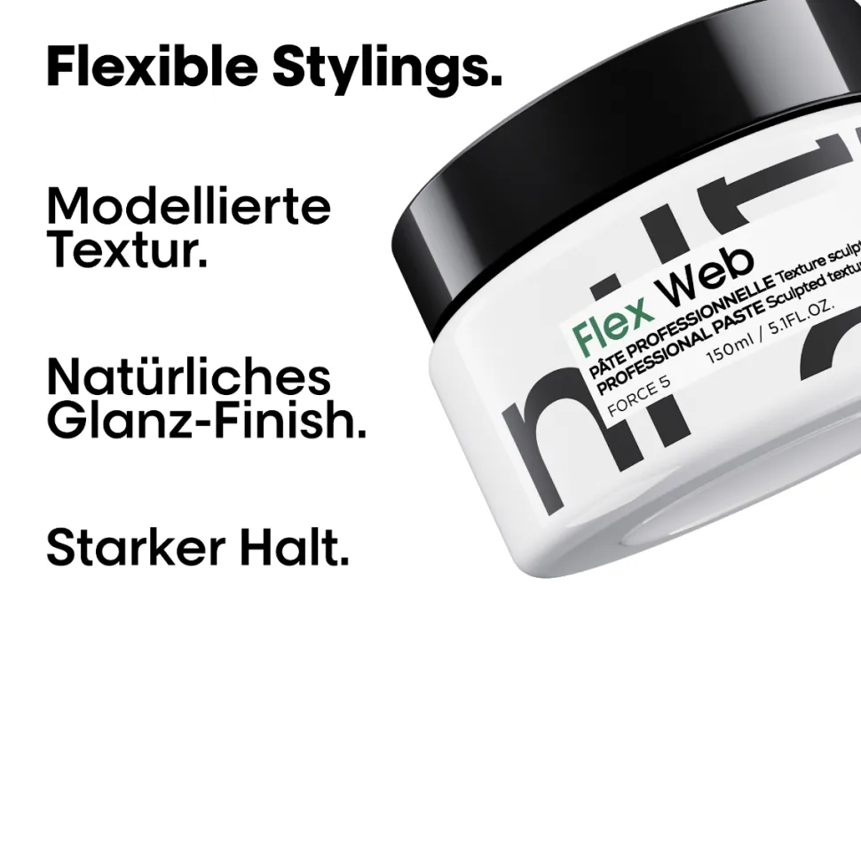 Die L’Oréal Professionnel Tecni.ART Flex Web ist eine professionelle Stylingpaste, die jederzeit flexibles Restyling ermöglicht und so einen strukturierten oder zerzausten Look mit definierten Strähnen ermöglicht.