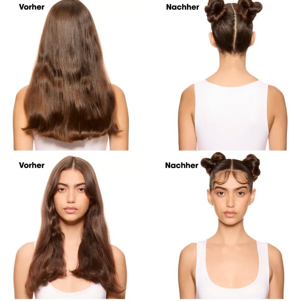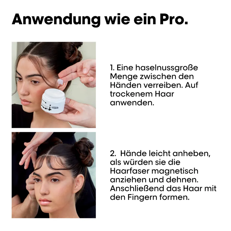 Auf trockenem Haar eine haselnussgroße Menge zwischen den Handflächen verreiben. Die Hände auseinanderziehen, um die Fasern zu dehnen, und dann durch das Haar streichen, um Textur und Bewegung zu erzeugen. Eine haselnussgroße Menge gleichmäßig auf dem Haar verteile. Falls nötig den Vorgang wiederholen. Abhängig von der Dicke der Haare.