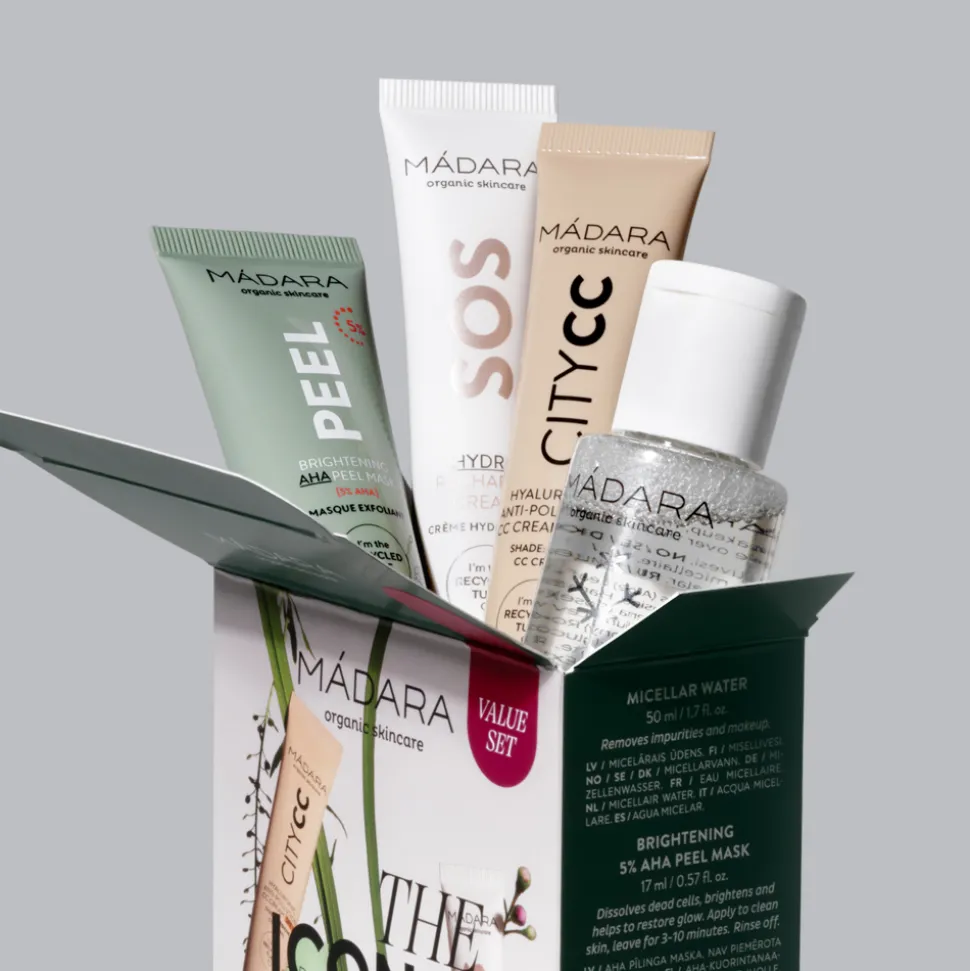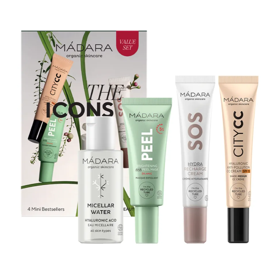 Das MÁDARA The Icons Set Medium enthält vier MÁDARA Basis-Hautpflegeprodukte in Testgröße, mit denen du deine Haut mit Inhaltsstoffen aus der nordischen Natur pflegen kannst. Perfekt zum Ausprobieren und auf Reisen. Dieses 4-in-1-Set bietet dir einen Mehrwert für deine Pflege.