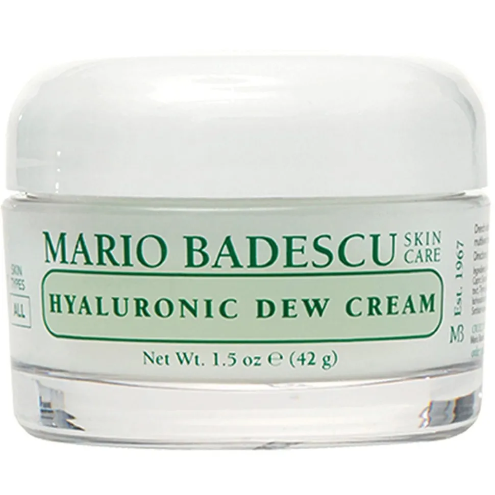 Die Mario Badescu Hyaluronic Dew Cream hüllt die Haut in einen überragenden, schwerelosen Schleier von üppiger Feuchtigkeit. Mit einem einzigartigen Komplex aus Squalan und zwei Molekulargewichten von Natriumhyaluronat versorgt die Formel die Haut auf mehreren Ebenen mit kühler und intensiver Feuchtigkeit. Zudem enthält die ölfreie Gel-Hybrid-Creme stärkenden Grüntee, klärenden Thymian und mineralreiche Gurke, um die Haut zu stärken und dem Teint ein frisches und vitales Finish zu verleihen.