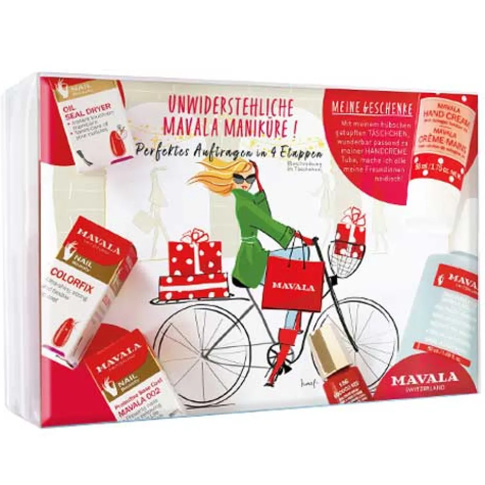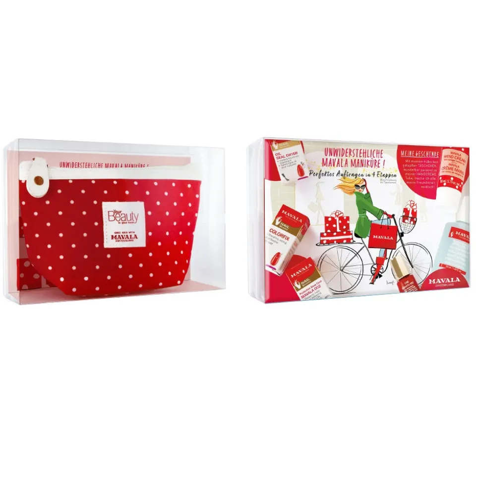 Das Mavala Maniküre Set inklusive Tasche enthält einen Mavala Nagellack Carrousel Color’s Rococo Red 5 ml, einen Mavala Basecoat 5 ml, einen Mavala Colorfix Überlack 5 ml, einen Mavala Oil Seal Dryer Nagellack 5 ml und ein Mavala Lackentferner blau 50 ml. Als Geschenk inklusive enthält das Set außerdem eine Mavala Handcreme mit Kollagen 50 ml und eine Kosmetiktasche.
