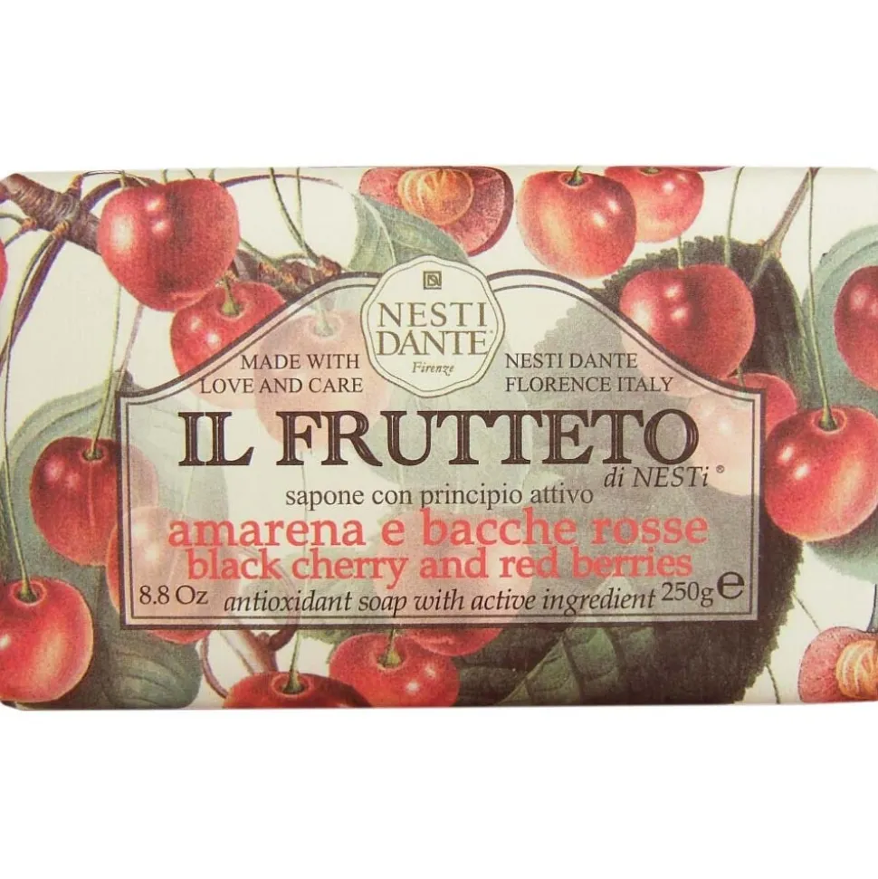 Die Nesti Dante IL Frutteto Black Cherry & Red Berries mit der intensiven Note der Schwarzkirsche ist angereichert mit Mineralsalzen und verleiht im Zusammenspiel mit den antioxidativen Eigenschaften der roten Beeren der Haut pickelnde Energie und Wohlbefinden.