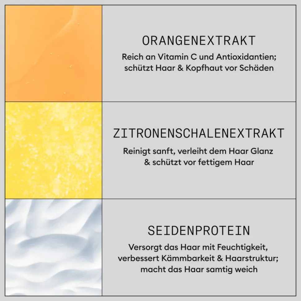 | Inhaltsstoffe | Aqua, Stearyl Alcohol, Behentrimonium Chloride, Cetyl Alcohol, Bis-Aminopropyl Dimethicone, Isopropyl Alcohol, Phenoxyethanol, Benzyl Alcohol, Parfum, Methylparaben, Propylparaben, Disodium EDTA, Propylene Glycol, Polysorbate 20, Vaccinium Myrtillus Leaf Extract, Saccharum Officinarum Extract, Citrus Limon Peel Extract, Acer Saccharum Extract, Citrus Aurantium Dulcis Fruit Extract, Hydrolyzed Silk, Aleurites Moluccana Seed Oil |
