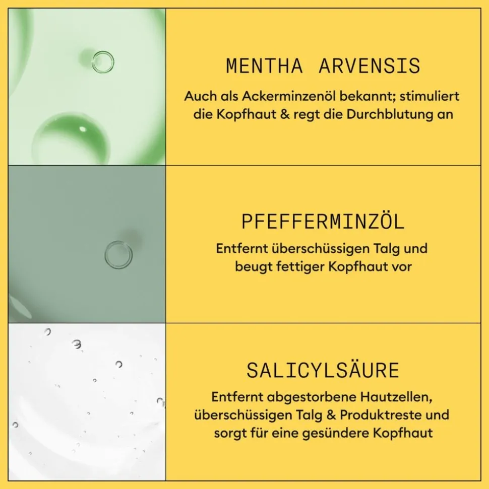| Inhaltsstoffe | Aqua, Sodium Laureth Sulfate, Sodium Lauryl Sulfate, Cocamidopropyl Betaine, Sodium Citrate, Sodium Xylenesulfonate, Sodium Chloride, Cocamide MEA, Sodium Benzoate, Citric Acid, Salicylic Acid, Mentha Piperita Oil, Mentha Arvensis Leaf Oil, Menthol, Tetrasodium EDTA, Sodium Hydroxide, Methylparaben, Propylene Glycol, Camellia Sinensis Leaf Extract, Cystine Bis-PG-Propyl Silanetriol, Biotin, Lecithin, Niacinamide, Panthenol, Tocopheryl Acetate, Citrus Paradisi Peel Extract, Humulus Lupulus Flower Extract, Urtica Dioica Leaf Extract, CI 42090, Faex Extract, Acer Saccharum Extract, Citrus Limon Peel Extract, Saccharum Officin |