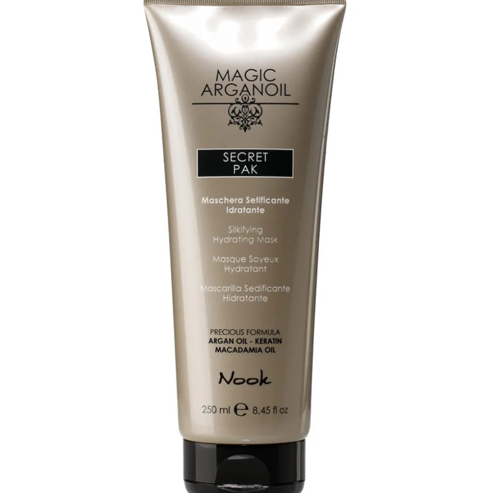 Die Nook Magic Argan Oil Secret Pak Seidenglanz-Haarmaske eignet sich besonders gut für trockenes und strapaziertes Haar. Mit zertifiziertem Bio-Arganöl, Macadamiaöl und Keratin, ideal für sehr trockenes und strapaziertes Haar und durch chemische Behandlungen beanspruchtes Haar. Sie verspricht intensive Pflege, ohne das Haar zu beschweren. Für glänzendes, seidenweiches Haar mit Spannkraft.