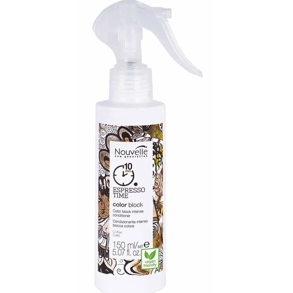 Das Nouvelle Espressotime Color Block ist ein intensiv wirkendes Conditioning Spray mit einem sauren pH-Wert, das die Haltbarkeit der Farbe intensiviert und das Haar pflegt. Die Formulierung schließt die Farbpigmente im Haar ein, spendet Feuchtigkeit und verbessert die Kämmbarkeit.