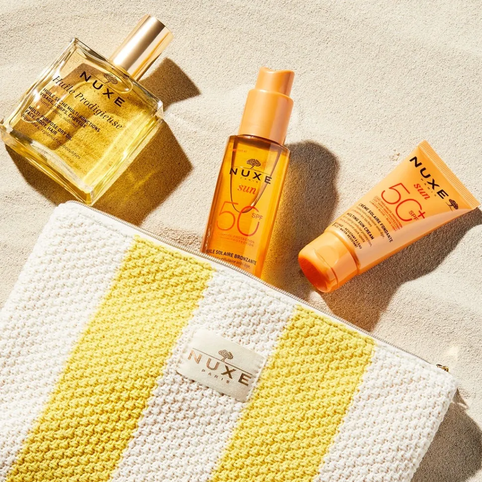 Das NUXE Kennenlernset Sommer mit gestreiftem gelb-beigen Sonnenetui vereint 3 Sommer-Essentials, um die Haut zu schützen und zu verschönern. Das Set ist zusammengesetzt aus einer Sonnencreme mit LSF 50+, einem Körperpföege-Öl und einem Sonnenöl mit LSF 50. Für eine gepflegte und geschütze Haut in der Sonne. Alle Produkte werden in Frankreich entwickelt und hergestellt. Das Set wird in einer gelb-beige gestreiften Tasche im Häkel-Look geliefert.