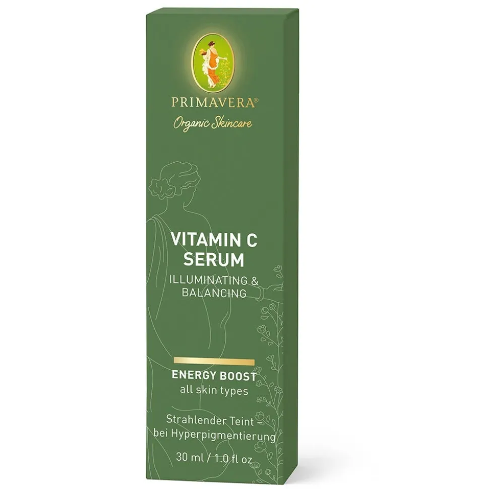 Das elegante PRIMAVERA Energy Boost Vitamin C Serum für alle Hauttypen verbessert sichtbar die Hautelastizität und sorgt für ein glattes, natürlich frisches Hautbild. Mit seiner sensitiven Textur und den natur- reinen Pflanzenkräften der weißen Strandlilie in Kombination mit Bio Limette, Bio Grüntee und Bio Kamillenblüte, steigert es die Hautfeuchtigkeit und wirkt antioxidativ bei gestresster Haut und mindert gezielt Pigmentflecken und -unregelmäßigkeiten.