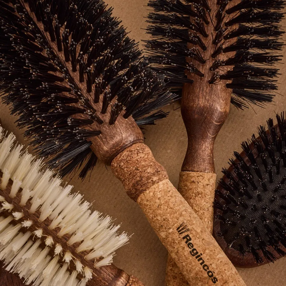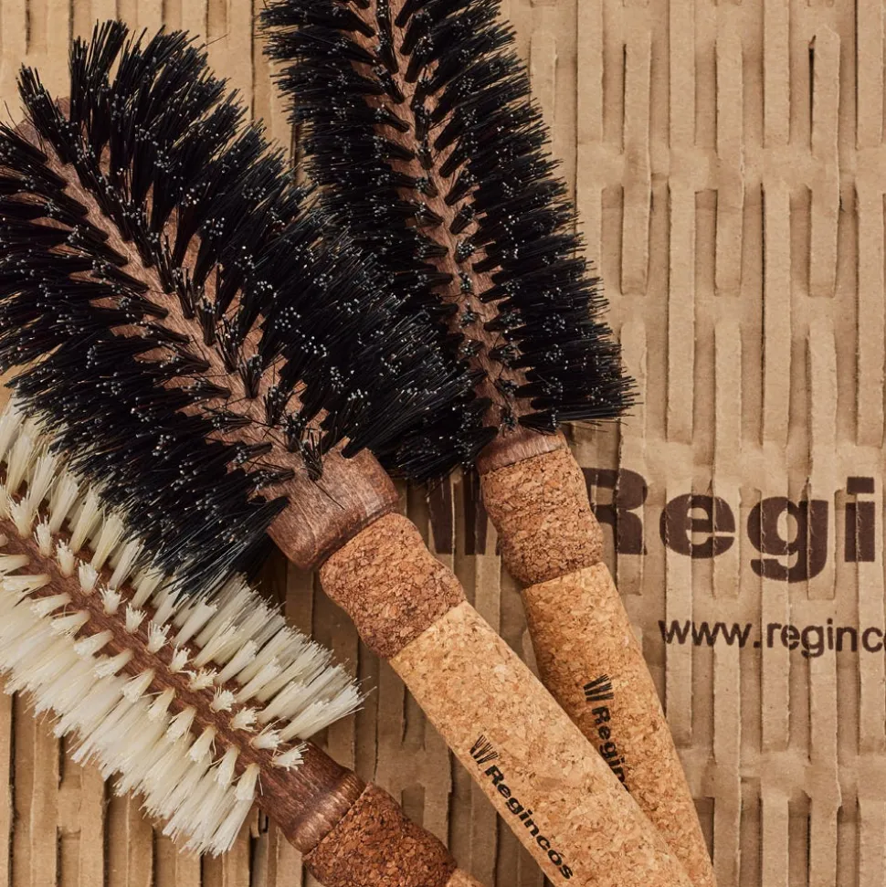 Die neue Regincós e.Cork Largo 24730 Rundbürste 19/55 mm L Rundbürste liegt mit ihrem extralangen, zweifarbigen Korkgriff noch komfortabler in der Hand. Zwischen dem traditionellen hellen Korkgriff und dem Bürstenkörper befindet sich ein dunkler Korkring, der für bessere Kontrolle beim Styling und bei Föhnfrisuren sorgt. Das Model Largo mit extra langem Bürstenkörper ist mit schwarzen Wildschweinborsten in Kombination mit einzigartigen hitzebeständigen Nylonborsten aus Kohlefaser bestückt und besonders für das Styling großer Haarpartien geeignet.