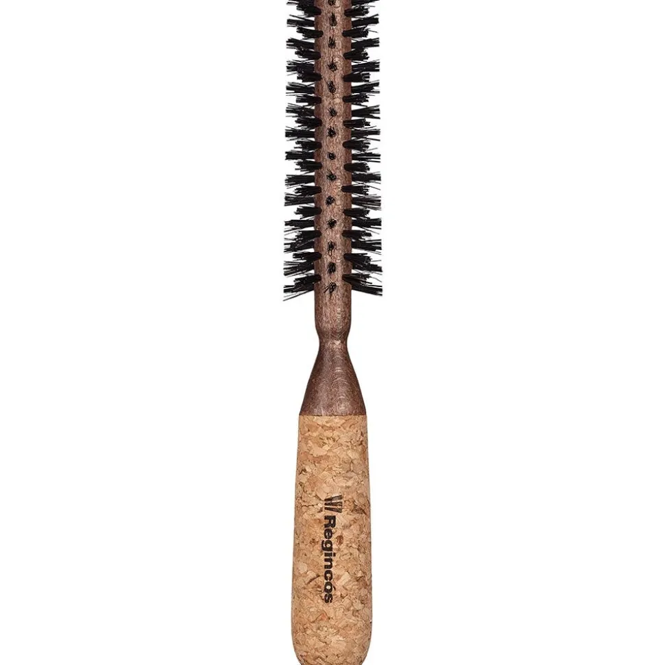 Der Bürstengriff der Regincós Rundbürste 20129 ist aus Kork und liegt besonders angenehm und leicht in der Hand. Die verstärkten Mischborsten (65 % Wildschwein, 35 % Nylon) pflegen das Haar und verleihen gesunden Glanz.