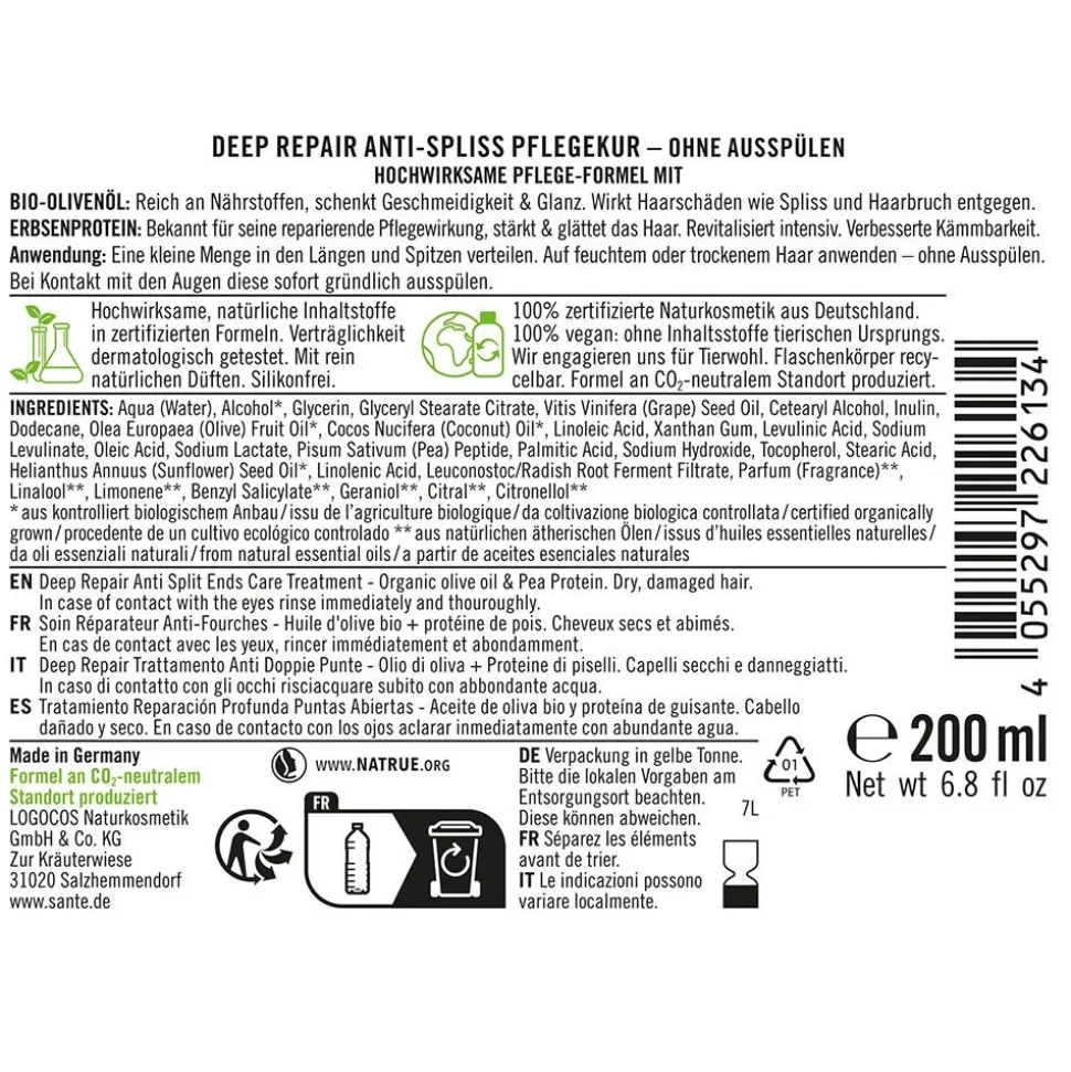 Die SANTE Deep Repair Anti-Spliss Pflegekur ist eine effektive Aufbaupflege für trockenes, strapaziertes Haar. Die vegane Formel mit pflanzlichem Squalan und dem 3-Fach Protein Komplex repariert die Haarstruktur bereits nach einer Anwendung, spendet tiefenwirksame Feuchtigkeit und schützt nachhaltig vor Spliss und Haarbruch. Das Haar wird von der Wurzel bis in die Spitzen gestärkt und erhält neue Geschmeidigkeit sowie sichtbar mehr Kraft. Die Verträglichkeit ist dermatologisch getestet.