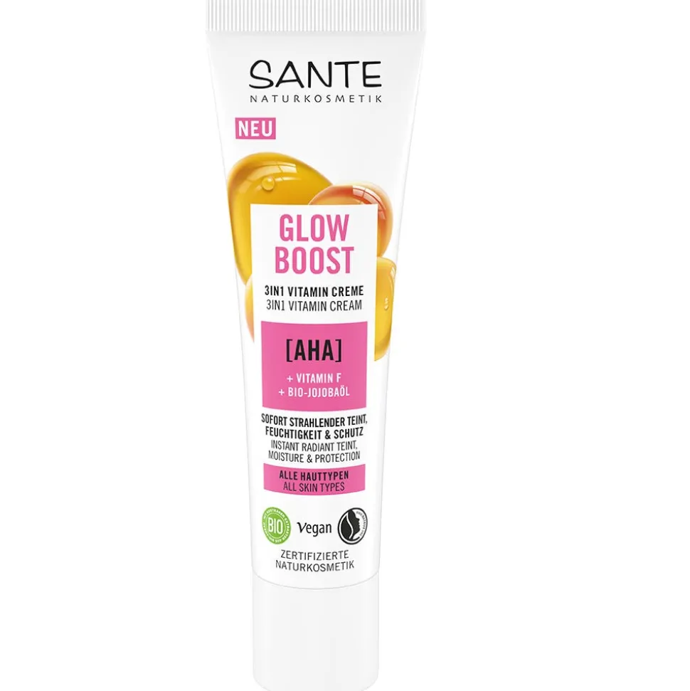 Die SANTE Glow Boost Aminosäure & Bio-Aloe Vera 3in1 Vitamin Creme wirkt sofort klärend und entfernt sanft abgestorbene Hautschüppchen. Die Creme verfeinert das Hautbild und sorgt für einen langanhaltend strahlenden Teint.