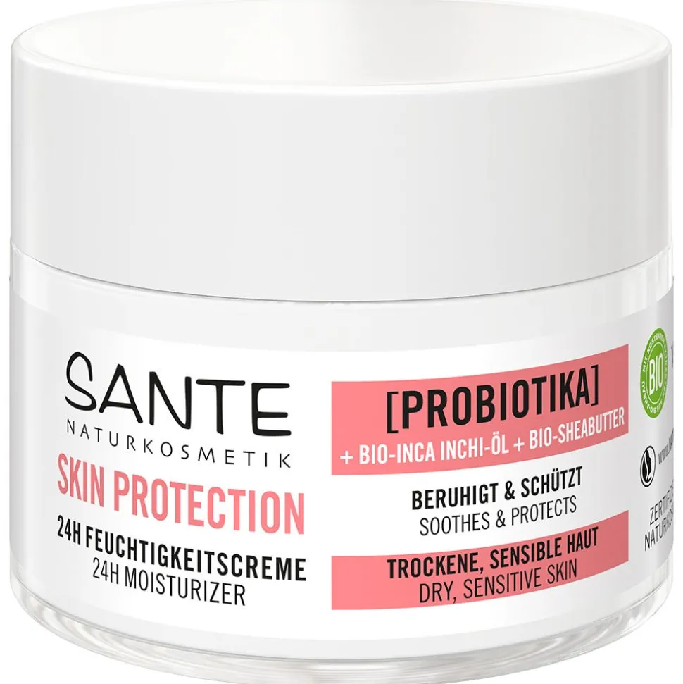 Die SANTE Skin Protection 24H Feuchtigkeitscreme Probiotika beruhigt und schützt die Haut. Die Formulierung ist angereichert mit Probiotika, Bio-Inca Inchi-Öl und Sheabutter für eine ausbalancierte Hautflora.