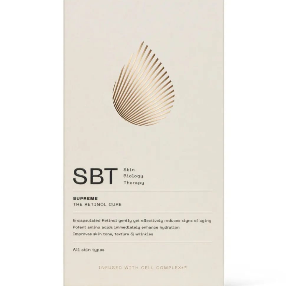 SBT Supreme The Retinol Cure – Diese revolutionäre Formel enthält eingekapseltes Retinol, das für eine lang anhaltende Zellerneuerung, weniger feine Fältchen und eine verbesserte Hautdichte sorgt. Die kraftvolle Mischung aus eingekapseltem Retinol und NovoRetin™ sorgt für einen sofortigen Lifting-Effekt und eine sichtbare Verjüngung.