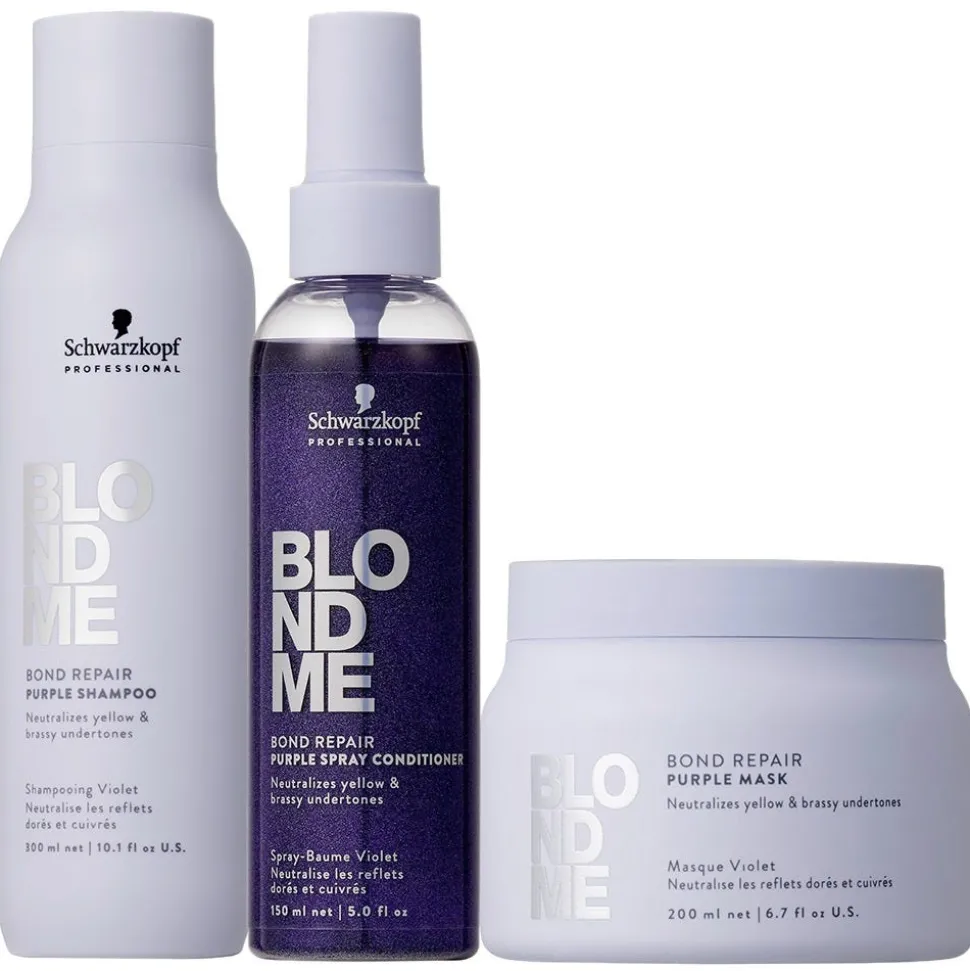 Das Schwarzkopf Blondme Purple Toning Bundle neutralisiert gelbe Untertöne und hilft, Messingtöne zu verhindern. Das Bundle enthält 1x Schwarzkopf Blondme Purple Toning Shampoo 300 ml, 1x Schwarzkopf Blondme Purple Toning Mask 200 ml und 1x Schwarzkopf Blondme Purple Toning Spray Conditioner 150 ml.