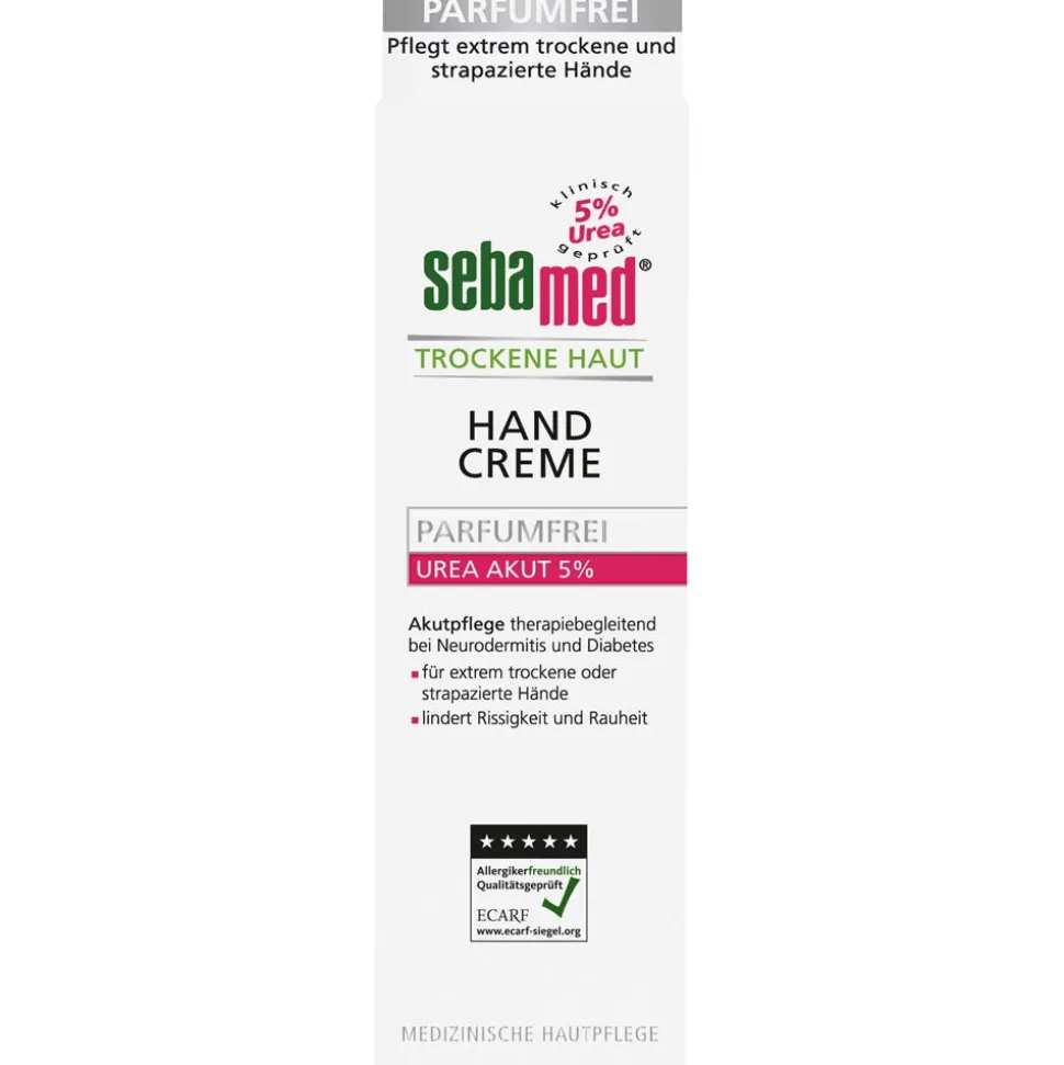 Die sebamed Hand-Creme Urea Akut 5% parfümefrei pflegt extrem trockene und strapazierte Hände, lindert Rissigkeit und Rauheit. Therapiebegleitend zur Handpflege bei Diabetes, Neurodermitis und Psoriasis. Die parfumfreie sebamed Trockene Haut Handcreme Urea 5% ist eine gut einziehende O/W Emulsion, die die Haut mit Feuchtigkeit versorgt und hilft, Reizungen zu mindern. Hochkonzentrierter Harnstoff (Urea) spendet intensiv Feuchtigkeit, lindert rasch Juckreiz und glättet sehr trockene Haut. Ein Wirkkomplex mit Panthenol fördert die Hautregeneration. Allantoin unterstützt die glättende und regenerierende Wirkung. Bisabolol, der Wirkstoff der Kamille, trägt zur Reizlinderung bei. Ein Lipid-Komplex aus Avocadoöl und Olivenöl verbessert die Hautglätte und trägt zum Schutz vor Austrocknung bei. Die Wirksamkeit und Verträglichkeit ist durch eine klinisch-dermatologische Anwendungsuntersuchung in einer deutschen Hautklinik bestätigt.