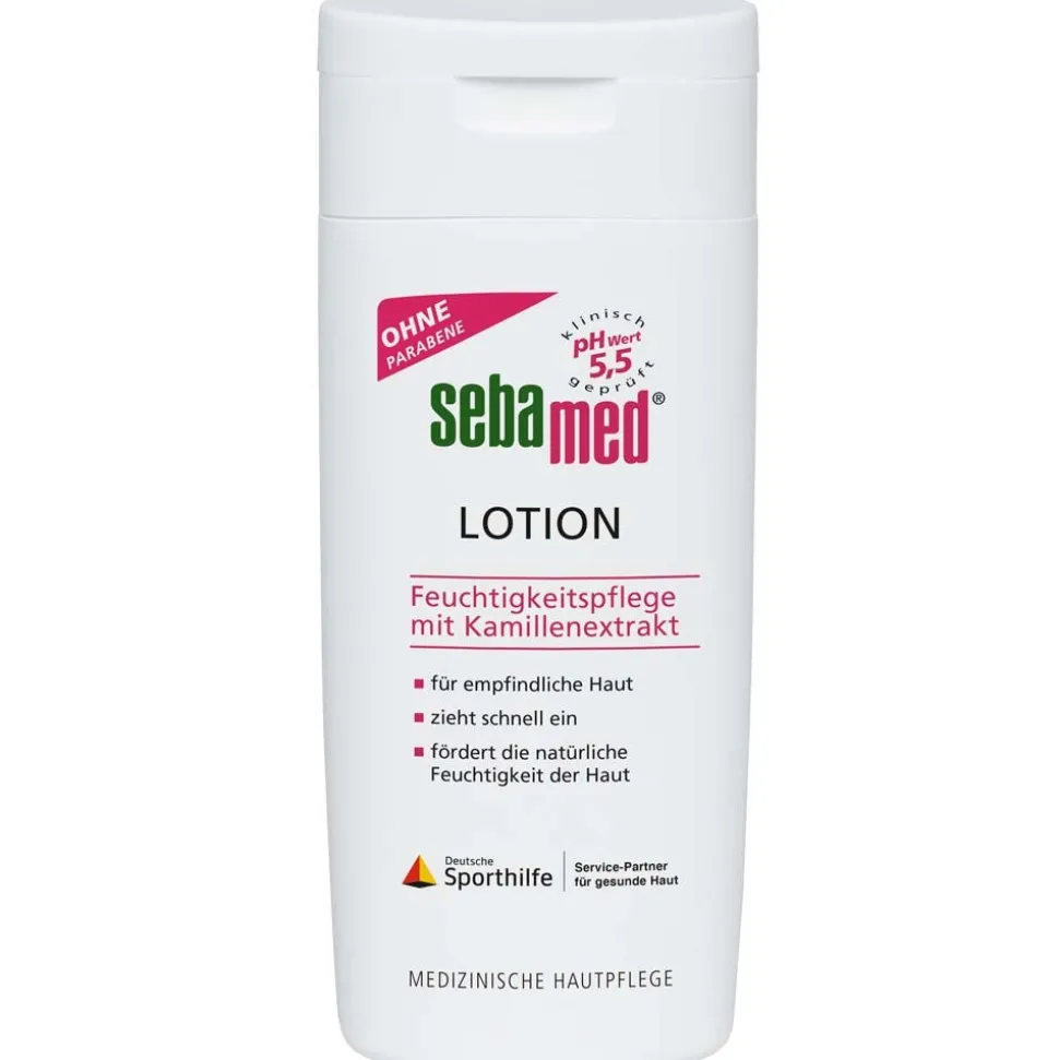 Die sebamed Lotion für empfindliche Haut, fördert die natürliche Feuchtigkeit der Haut und pflegt mit Kamillenextrakt und Allantoin. Die leichte, feuchtigkeitsspendende Öl-in-Wasser Emulsion ist ideal für das tägliche Eincremen und speziell auf die Bedürfnisse der empfindlichen Haut abgestimmt. Sie fördert die natürliche Feuchtigkeit der Haut, macht sie glatter und geschmeidiger, verleiht der Haut mehr Spannkraft und pflegt mit Kamillenextrakt und Allantoin. Der natürliche pH-Wert 5,5 stabilisiert den Hautschutzmantel. Damit wird die Widerstandskraft der Haut gegen schädliche äußere Einflüsse gestärkt. Frei von Parabenen.