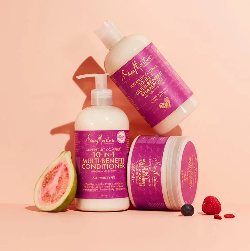 Der SheaMoisture Superfruit Complex 10in1 Multi-Benefit Conditioner nährt und pflegt lockiges und welliges Haar. Die Formel mit Superfood-Komplex enthält unter anderem wertvolles Marula Öl und Biotin um die Haarfaser intensiv zu nähren und weich und geschmeidig zu machen. Der Conditioner versieget die Schuppenschicht und macht die Locken samtig und definiert.