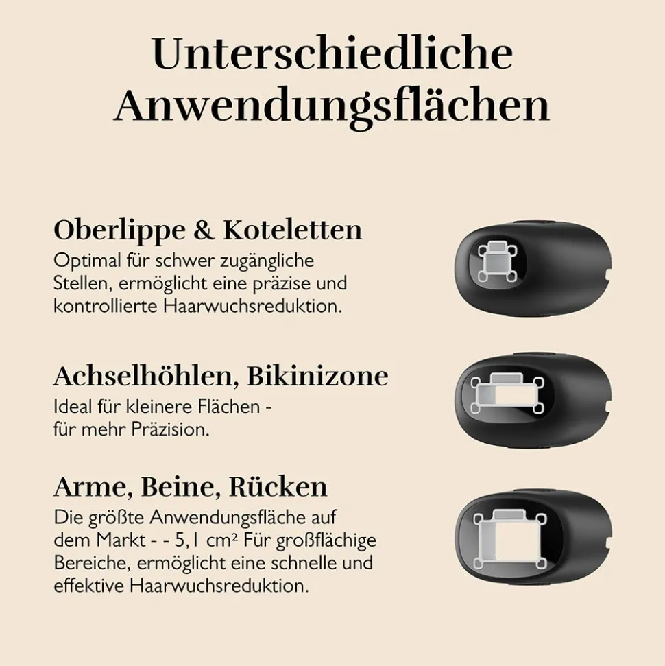 Nach jahrelanger Forschung und Entwicklung ist der Silk’n 7 nun endlich da. Das erste IPL-Gerät mit drehbarem Kopf für eine dauerhafte Haarreduzierung an schwer zugänglichen Stellen, die deine Haut seidig glatt und haarfrei macht. Mit sechs verschiedenen Winkeln kannst du dieses Gerät von Kopf bis Fuß verwenden. Um noch genauer arbeiten zu können, enthält dieses Gerät drei Aufsätze, die für verschiedene Körperteile geeignet sind. Der größte Aufsatz mit der größten Spotgröße auf dem Markt (5,1 cm²) kann für größere Bereiche wie Arme, Beine und Rücken verwendet werden; der mittlere Aufsatz (2,5 cm²) ist ideal für die Achselhöhlen und die Bikinizone; der kleinste Aufsatz (1 cm²) ist perfekt für kleinere Gesichtsbereiche wie die Oberlippe und für Koteletten. Für mehr Bewegungsfreiheit ist das Gerät mit einem 3 m langen Netzkabel ausgestattet.