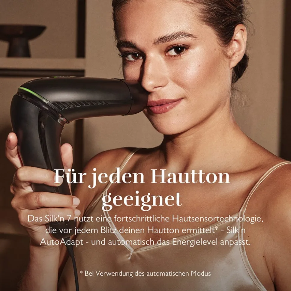 Dieses Haarentfernungsgerät ist für alle Hauttypen geeignet, auch für die dunkelsten Hauttöne. Dank der fünf Intensitätsstufen kannst du anhand der Farbkarte diejenige auswählen, die am besten zu deiner Haarfarbe und Hautton passt. Der Silk’n 7 verwendet außerdem eine fortschrittliche Hautsensortechnologie, Silk’n AutoAdapt, die den Hautton direkt vor jedem Blitz erfasst. Wenn du die Automatik verwendest und deine Haut zu dunkel für eine bestimmte Energiestufe ist, ändert das Gerät automatisch die Energiestufe für dich. Bei Verwendung des manuellen Modus leuchtet der Sensor auf und das Gerät hört auf, Lichtimpulse zu senden.