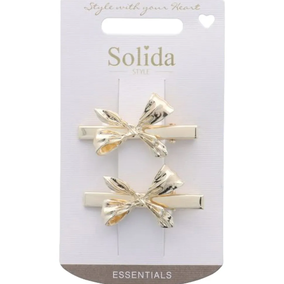 Die Solida Haarclips Metall Gold sind mit einer stilvollen Schleifenapplikation verziert und setzen elegante Akzente in jeder Frisur. Ihr edles Gold-Finish verleiht deinem Look eine besondere Note. Ideal zum Fixieren einzelner Strähnen oder für dezente Half-Up-Stylings – mit zuverlässigem Halt und modischem Charme.