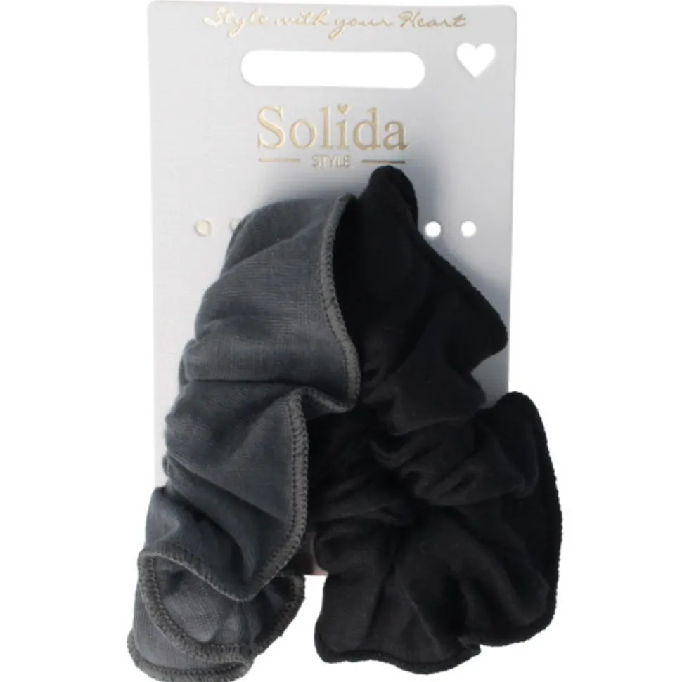 Diese Solida Scrunchie grau/schwarz vereint Schlichtheit und Eleganz. Die weichen Stoffe bieten zuverlässigen Halt und sind dabei besonders sanft zum Haar und daher perfekt geeignet für den Alltag.