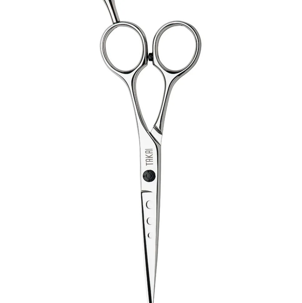 Klassische gerade Form mit abschraubbarem Fingerhaken. Drei Löcher im Scherenblatt der Takai Schere Zoom 55 garantieren eine perfekte Ausbalancierung und erleichtern das Ausstoßen feinster Härchen.