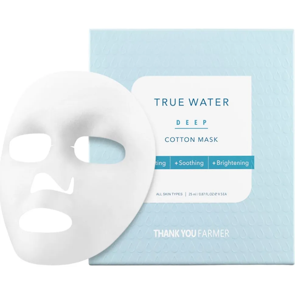 Die Thank You Farmer True Water Deep Cotton Mask bestehen aus reiner Baumwolle und sind mit einer feuchtigkeitsspendenden Essenz gefüllt, die den Feuchtigkeitsgehalt der Haut schnell wieder auffüllt. Idealer Hauttyp: Trocken