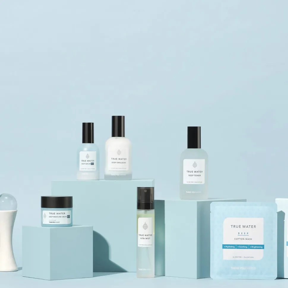 Die feuchtigkeitsspendende Thank You Farmer True Water Deep Emulsion, die den Glanz der Haut wiederherstellt, indem sie reichhaltige Nährstoffe liefert und eine Feuchtigkeitsbarriere bildet. Idealer Hauttyp: Trocken