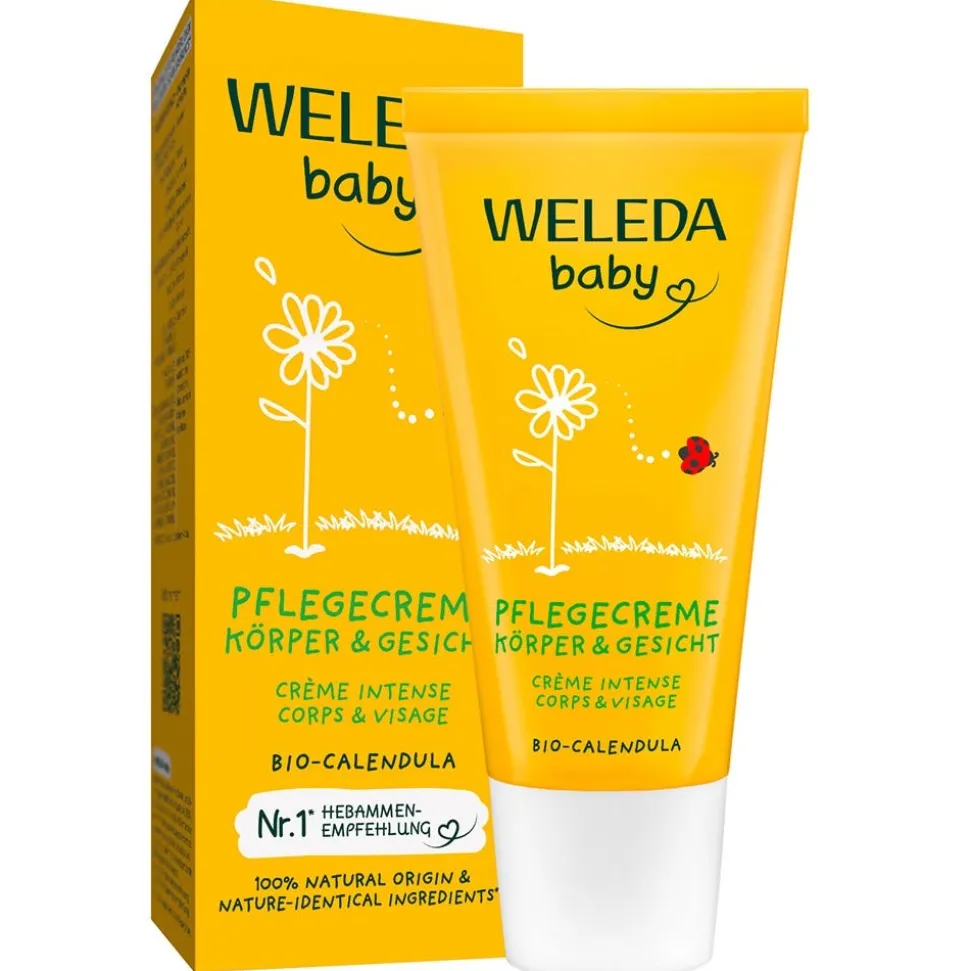 Die Weleda Calendula Pflegecreme Körper & Gesicht pflegt trockene Hautstellen und schützt und beruhigt die Haut deines Kindes.